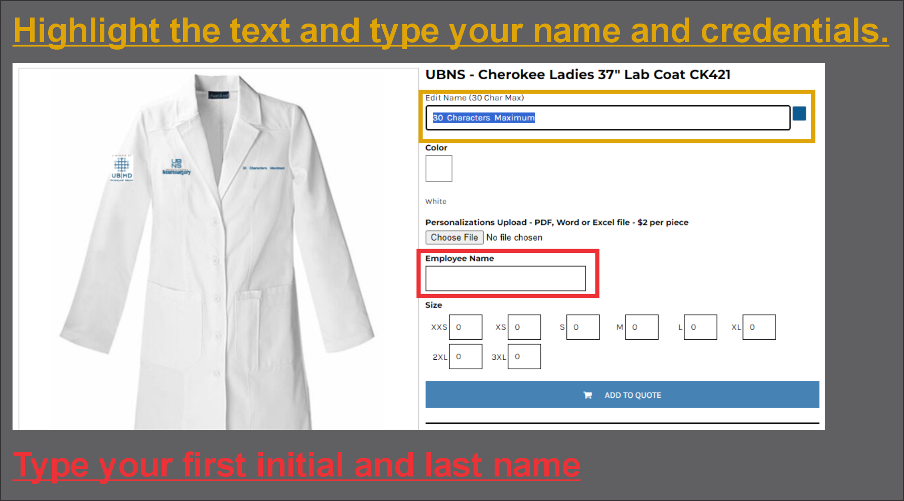 When you are selecting products that will have your name and credentials on them you must enter your name and credentials where indicated as shown in the image on the right. Some products also have an Employee Name field that also needs to be filled in with your first initial and last name.
